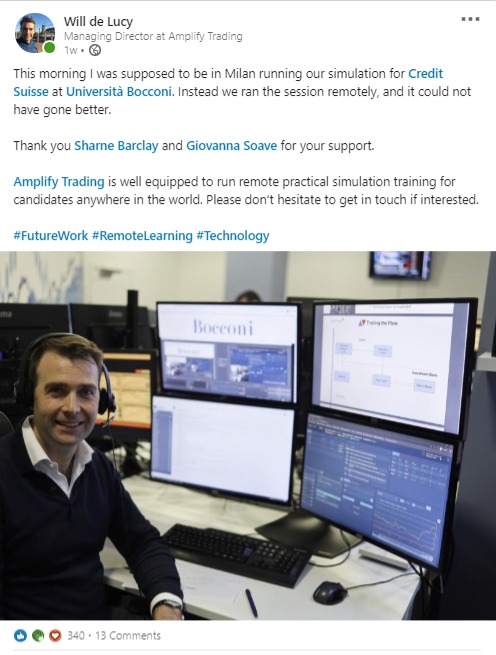 A key component to our expanded offering for all clients this year is our bespoke multi-camera, state-of-the-art virtual room, Trading-Live. This platform has been built by Amplify Trading specifically to house our practical training and simulations, with seamless two-way activity between all candidates and the Amplify Trading team.
