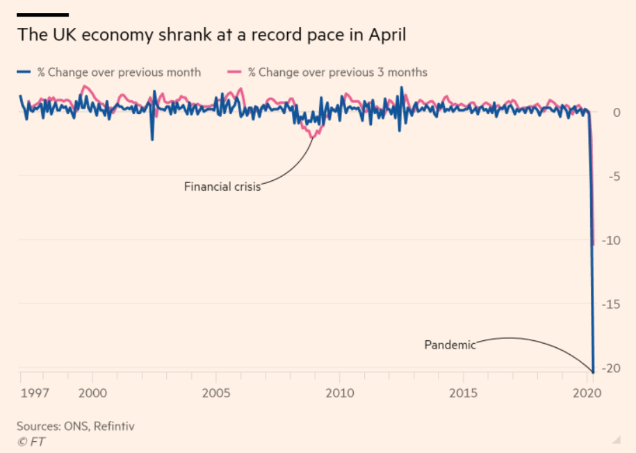 Last week, the UK economy shrunk by a quarter with output falling at the fastest monthly rate on record. “April’s fall in GDP is the biggest the UK has ever seen, more than three times larger than last month and almost 10 times larger than the steepest pre-Covid-19 fall,” said Jonathan Athow, deputy national statistician for economic statistics at the ONS.